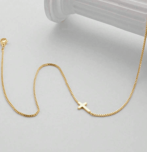 Soft, refined, and beautifully symbolic, the Side of Grace Necklace offers a modern take on a cherished emblem of faith. Crafted in radiant gold-plated stainless steel, its delicate sideways cross rests flush against the chain, creating a seamless silhouette that feels both contemporary and deeply heartfelt.